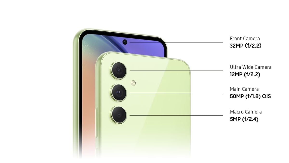 फोटोग्राफी के लिए Samsung Galaxy A54 5G फोन में ट्रिपल रियर कैमरा सेटअप दिया गया है। इसका प्राइमरी कैमरा 50MP का है, जिसके साथ OIS सपोर्ट मिलता है। इसके साथ 12MP का अल्ट्रा-वाइड सेंसर और 5MP का मैक्रो कैमरा मौजूद है। सेल्फी व वीडियो कॉलिंग के लिए फोन में 32MP का कैमरा दिया गया है।