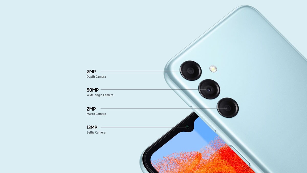 Samsung Galaxy M14 5G के बैक में ट्रिपल कैमरा सेटअप मिलता है। इस फोन का प्राइमरी कैमरा 50MP का है, जिसके साथ 2MP का डेप्थ और 2MP का मैक्रो कैमरा मिलेगा। सेल्फी और वीडियो कॉलिंग के लिए इस फोन में 13MP का कैमरा दिया गया है।