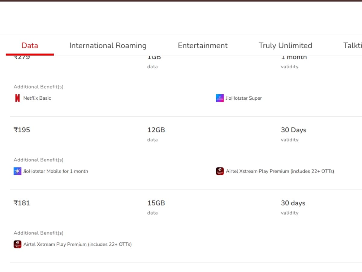 अन्य बेनेफिट्स की बात करें, तो इस डेटा वाउचर में मनोरंजन के लिए JioHotstar का सब्सक्रिप्शन का एक महीने के लिए दिया जा रहा है। इस पैक में एयरटेल एक्सट्रीम का एक्सेस भी मुफ्त में मिल रहा है। इस प्लान की वैधता 30 दिन यानी 1 महीने की है।