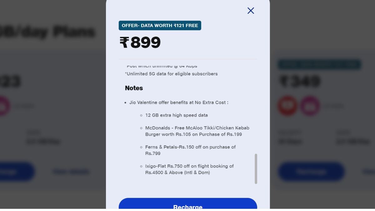 Jio कंपनी जिन दो प्रीपेड रिचार्ज प्लान के तहत Valentine’s Offer ऑफर लेकर आई है, उनकी कीमत 349 रुपये और 899 रुपये है। 14 फरवरी से पहले अगर आप इन दोनों में से कोई-सा भी प्लान अपने नंबर पर एक्टिवेट कराते हैं, तो आपको टेलीकॉम बेनेफिट के साथ-साथ कई और खास बेनेफिट्स भी प्रोवाइड किए जाएंगे। और पढें: JioFinance दे रहा Gold जीतने का शानदार मौका, साथ में मिल सकता है 10 लाख तक का इनाम