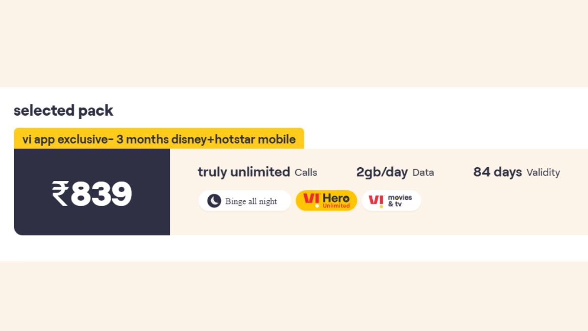 Vodafone Idea कंपनी 839 रुपये वाले प्लान के साथ Disney+ Hotstar Mobile का मुफ्त सब्सक्रिप्शन दे रही है। हालांकि, यह Vi app exclusive ऑफर है। इसका मतलब यह है कि यह ऑफर केवल वीआई ऐप यूजर्स को ही प्राप्त होगा।