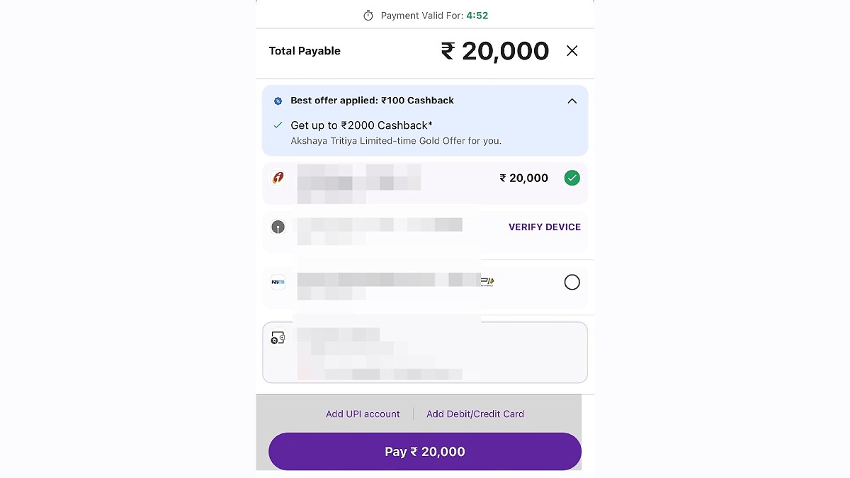 Step 6: Select the bank account to make a UPI payment to purchase the gold.