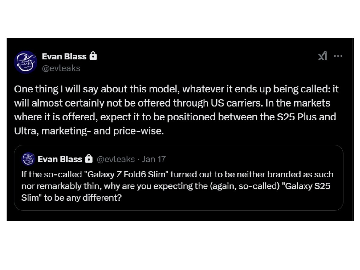 Evan Blass wrote in his private post on X, “One thing I will say about this model, whatever it ends up being called: it will almost certainly not be offered through US carriers. In the markets where it is offered, expect it to be positioned between the S25 Plus and Ultra, marketing- and price-wise.”