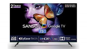 SANSUI 4K Ultra HD Smart LED Google TV (75-inch) has a 3840 x 2160 pixels resolution and a refresh rate of 60Hz. It comes with Google TV OS, in-built Wi-Fi, in-built Chromecast, 2GB RAM and 32GB ROM.