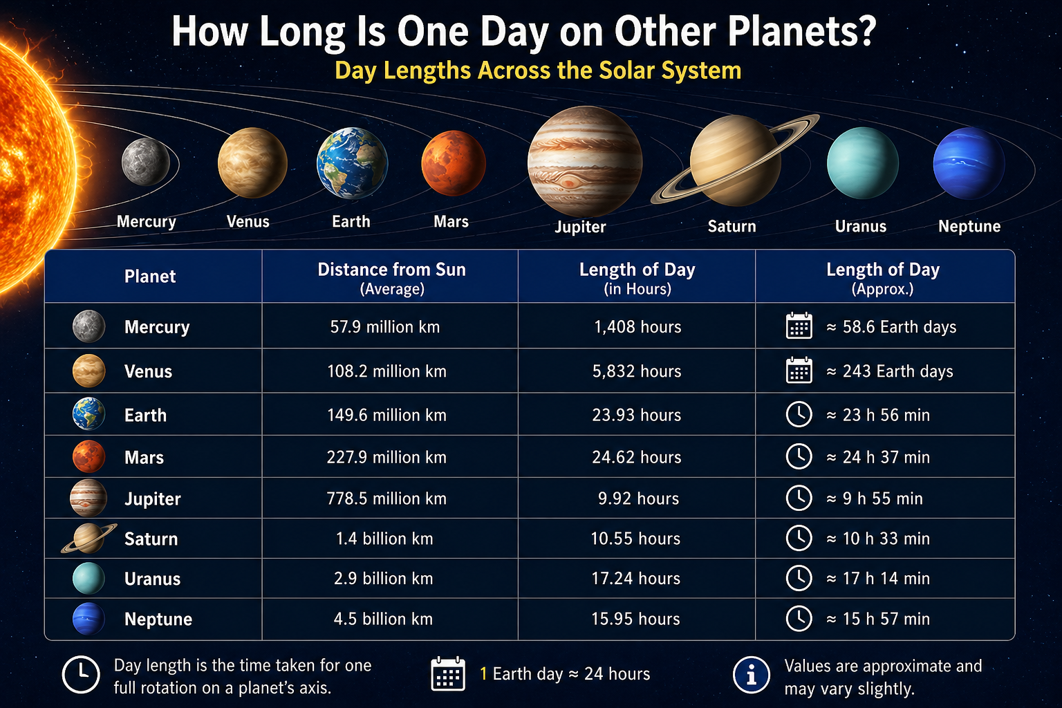 This difference is small for us, but it becomes easier to notice once you look at other planets. Each one spins at its own pace, and that directly decides how long a day lasts there.