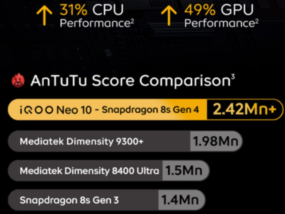The standout feature of the iQOO Neo 10 is the powerhouse Snapdragon 8s Gen 4. This is a leap forward from last year's Snapdragon 8s Gen 3, with a 31% boost in CPU and a 49% boost in GPU performance. On AnTuTu, the Neo 10 scores over 2.42 million, outshining rivals like the Dimensity 9300+. This could be one of the best phones for raw power, as it is built to handle everything from graphically intensive games to smooth multitasking with ease.