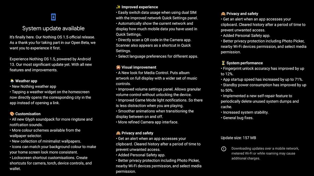 Nonetheless, the update brings quite a few changes. The update appears to also offer improved battery life improvement. The update carries a size of 157MB and it brings changes to the weather app, offers a new Glyph soundpack, more color schemes, and a new collection of wallpapers.