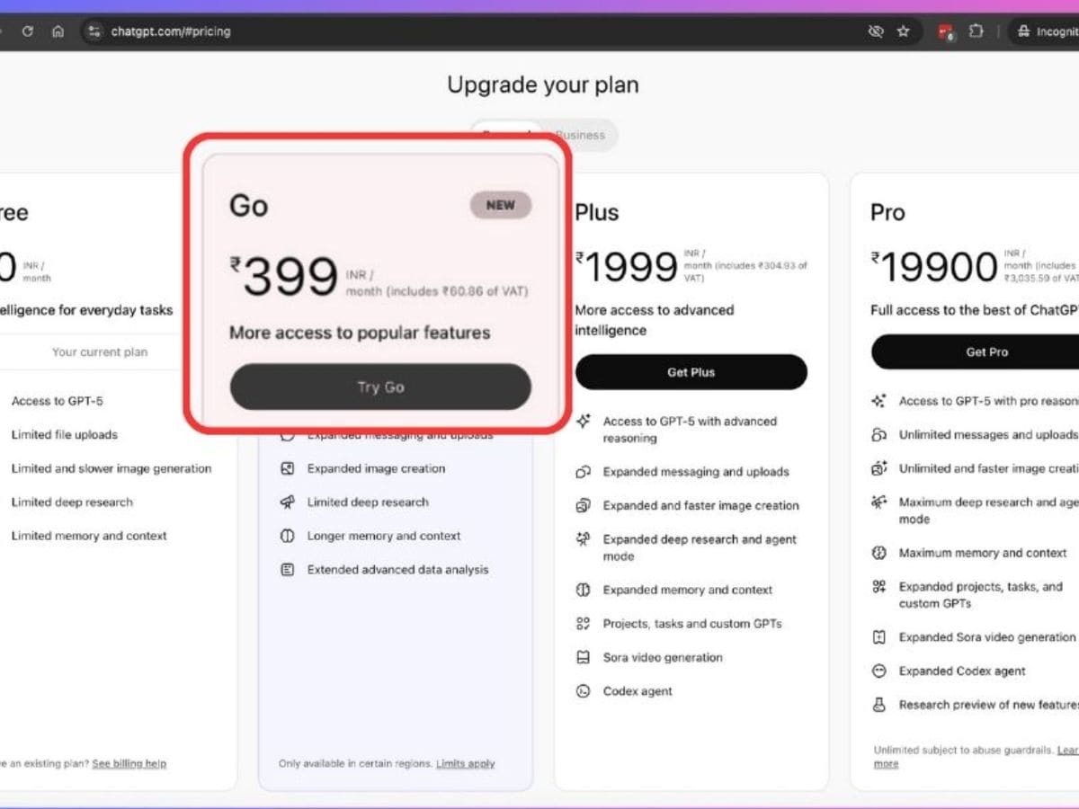 ChatGPT Go is priced at Rs 399 per month in India, which proves to be significantly cheaper than ChatGPT Plus, which is available at Rs 1999 per month. The plan can be accessed across web, iOS, Android, and desktop versions of ChatGPT.