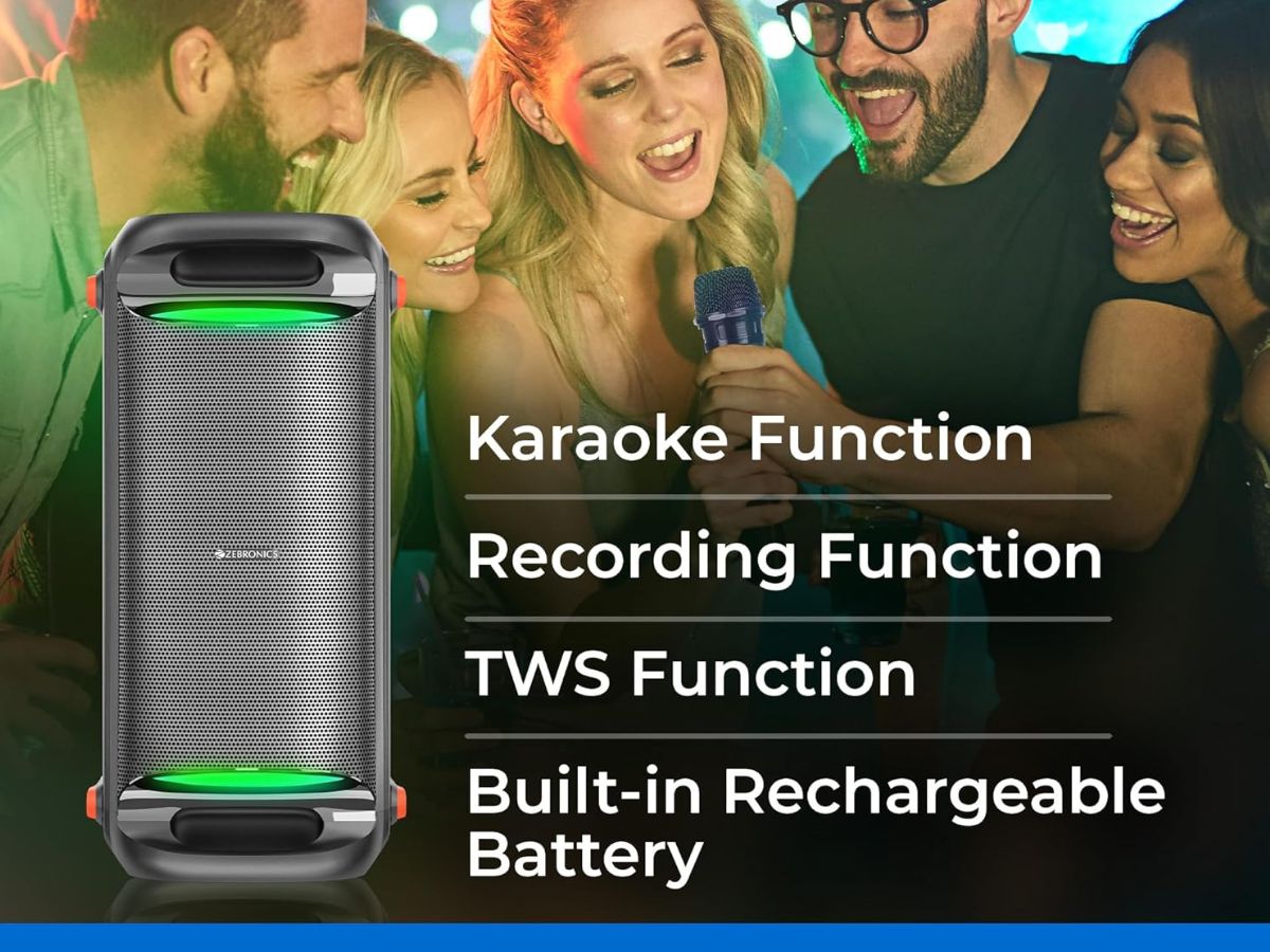The Zebronics Party Fyre 102 delivers 200W output with dual 25.4 cm full-range drivers for powerful sound. It offers up to 9 hours of playback and supports Bluetooth 5.0, USB, SD, mSD, and AUX connectivity. The speaker includes karaoke support with dual wireless UHF microphones and TWS pairing. It also features RGB lighting and 6-band EQ control, and is priced at Rs 14,999.