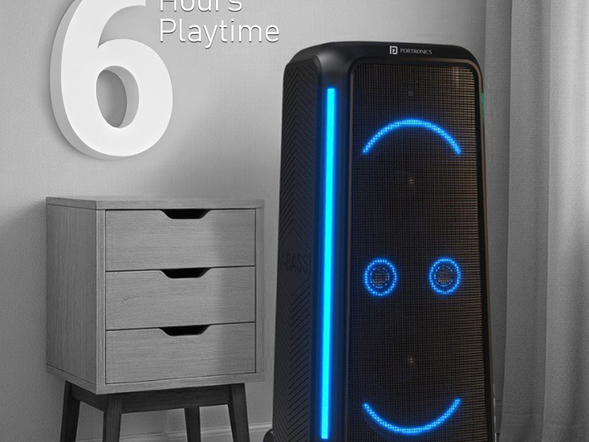 The Portronics Iron Beats 5 Prime delivers 250W output with dual 8-inch subwoofers for deep bass. It offers up to 6 hours of playtime and includes a wireless UHF microphone for karaoke. The speaker supports Bluetooth connectivity and features bass boost technology. It also comes with wheeled design and LED lights, and is priced at Rs 12,799.