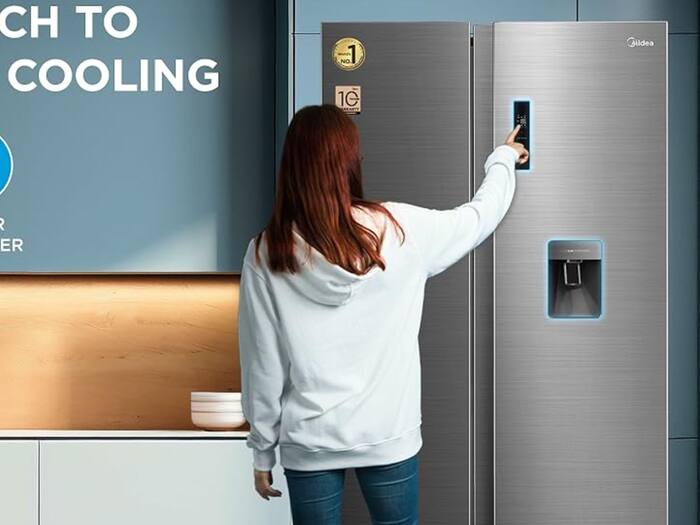 The Midea 560L Side-by-Side Frost Free Refrigerator has 560 liters capacity. It comes with a water dispenser and an inverter compressor for energy efficiency. The refrigerator offers frost-free cooling for easy maintenance. The price is Rs. 47,990.