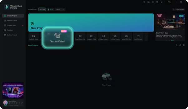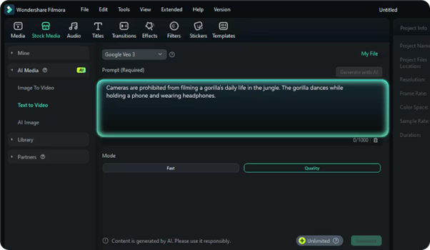 Step 2: At this point, the AI Text to Video in Filmora is opened. Choose Google Veo 3, and enter your idea of animation. You may also press the button Generate with AI to get instant suggestions.