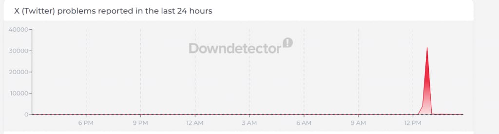 X was primarily down in the US at around 12:46 PM with its peak of 30,000 reports.