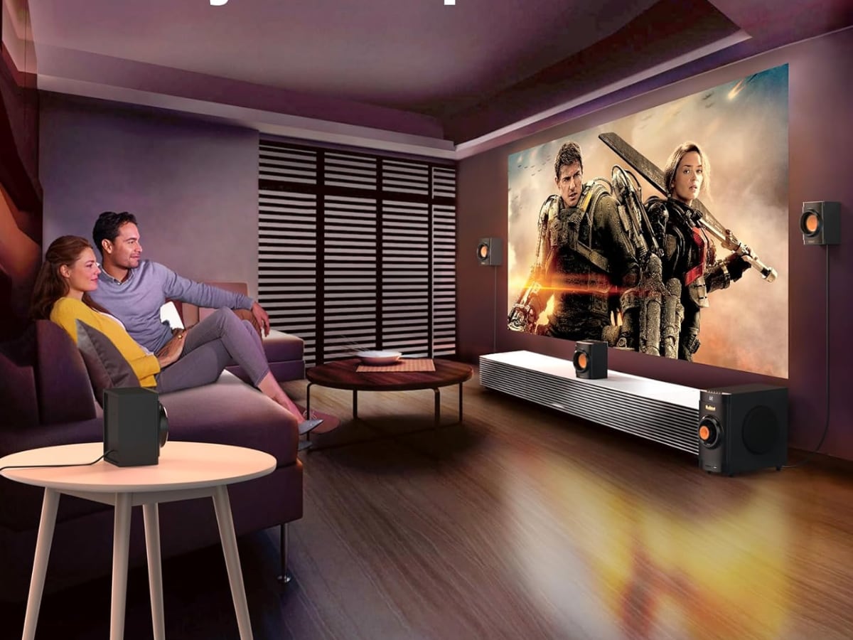 A home theatre system is designed to deliver cinema like sound experience at home. It usually includes a soundbar or speakers with a subwoofer for deep bass and surround sound. These systems support multiple connectivity options like Bluetooth, HDMI and optical for easy setup with TVs and other devices.