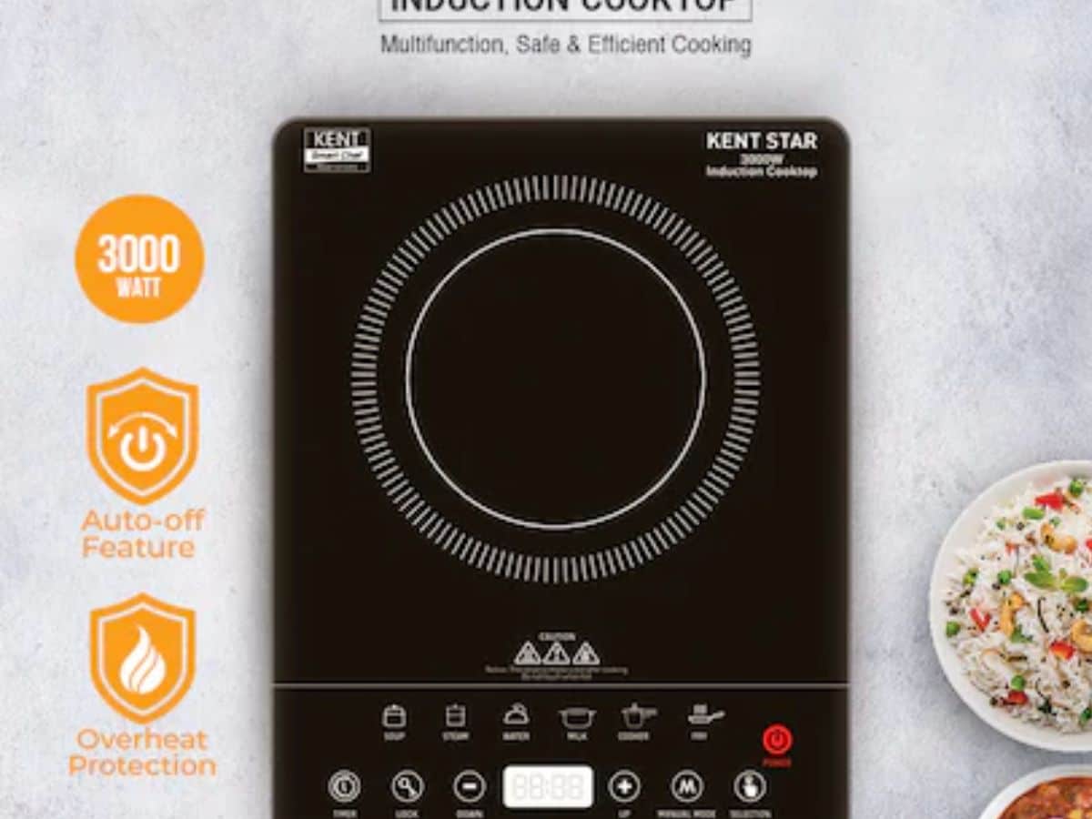 The KENT Star Induction Cooktop comes with 3000 W power for fast cooking. It features 6 preset menus, a microcrystalline glass surface, and feather touch controls. The cooker also offers overheat protection and auto turn-off for safety. Price: Rs 4,399.