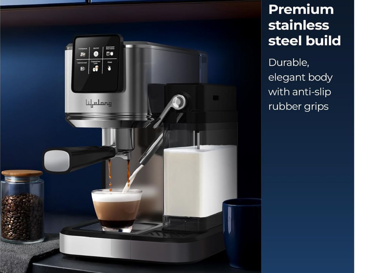 The Lifelong Eden Primiera 1350W Digital Coffee Machine is priced at Rs 13,999 and comes with a built-in milk tank. It features an Italian Ulka pump with 20 bar pressure for strong espresso extraction. The machine supports double shot, espresso, hot and cold brew, cappuccino, and latte preparation. It also has a touchscreen display for easy operation.
