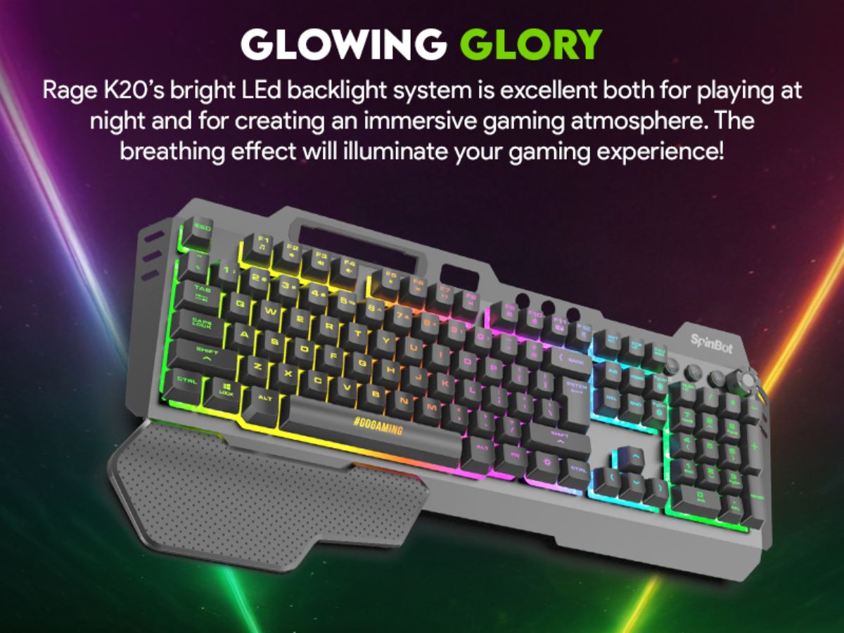 The SpinBot Rage K20 is a wired USB gaming keyboard with an LED backlit design. It features a metal body, 19 anti-ghosting keys, and a volume control knob. The color is black. The price is Rs 1,099.