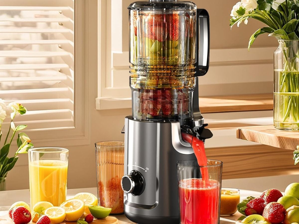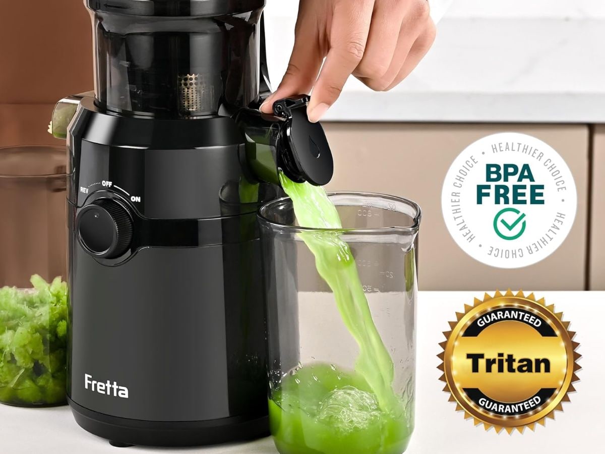 Fretta cold press juicer comes with a 1.1L large feed chute that can take whole fruits and vegetables. It uses slow chew technology for better juice extraction and less heat. The machine has a self-feed design and is easy to clean after use. The price of this juicer is around Rs 18,486