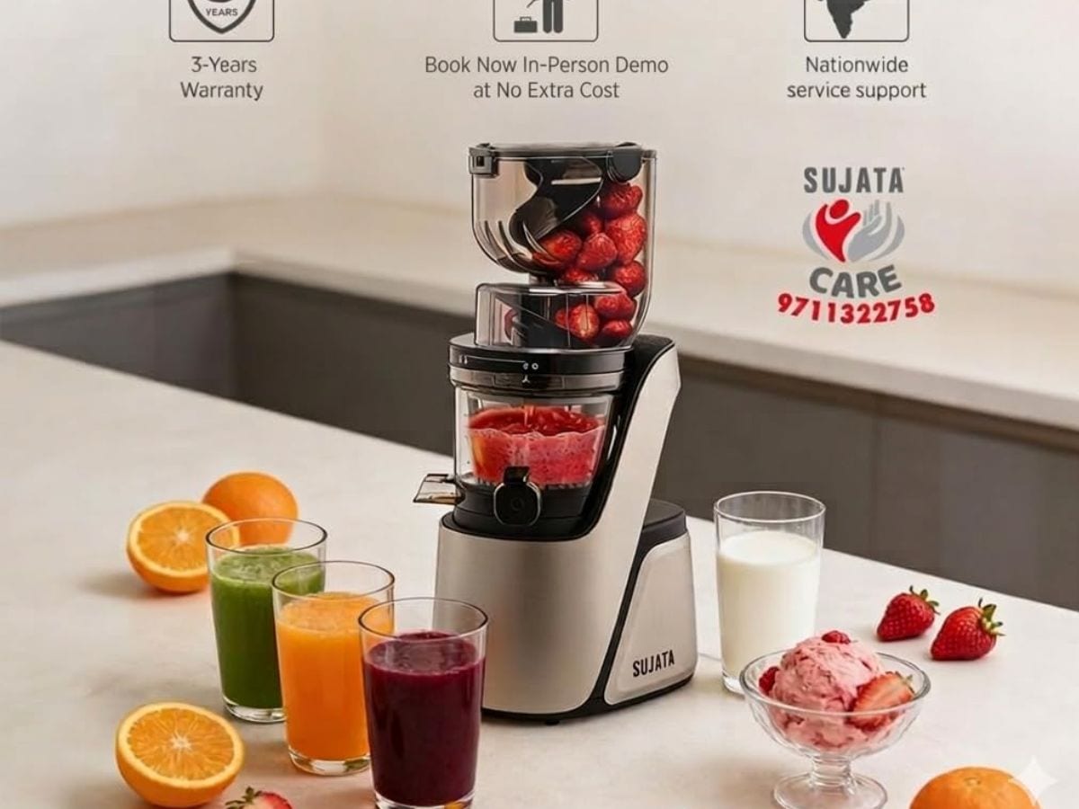 Sujata SJ01 cold press juicer comes with a dual feeding chute for fruits and vegetables. It supports juice, smoothies, nut milk, and frozen desserts. The machine includes a reverse function and magnetic safety lock for safe use. The price of this juicer is around Rs 17,989