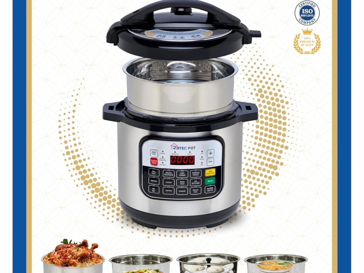 The RTECPOT Multipurpose Electric Pressure Cooker offers 7-in-1 functionality for different cooking needs. It comes with a stainless steel bowl and a specially designed partition for multi-cooking. The appliance includes a 1-year warranty for reliability. The price of this model is Rs 8,999.