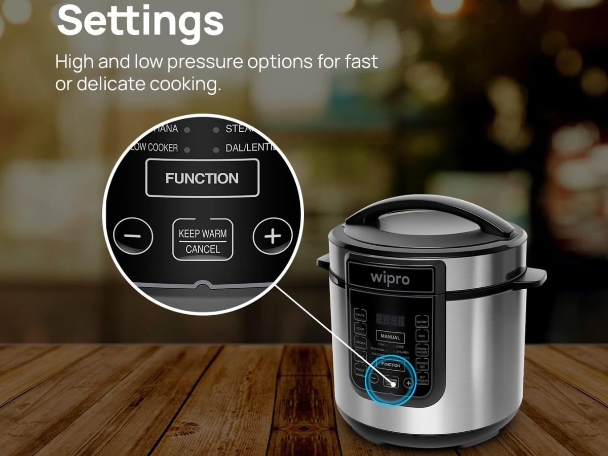 The Wipro Elato CPC201 Digital Electric Pressure Cooker comes with a 6 litre capacity and operates at 1000 watts. It offers 10 pre-set multi cooking functions for easy use. The appliance features advanced microprocessor control and a safety lock mechanism. It includes a stainless steel pot and is priced at Rs 7,999.