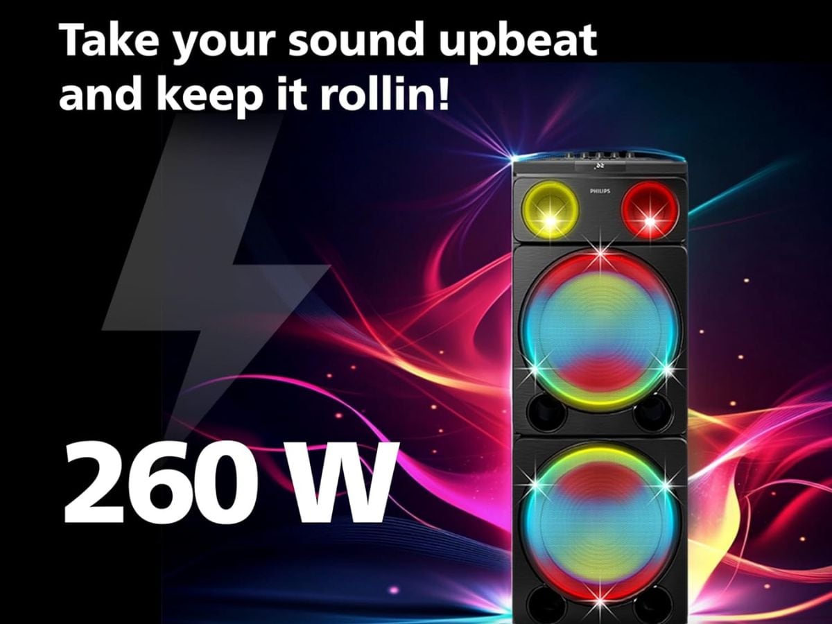 The Philips TAX5206 party speaker is priced at Rs 15,990 and delivers 160W output power. It comes with two 8-inch woofers and two 2.5-inch tweeters for balanced sound. The speaker offers up to 14 hours of playback time on a single charge. It includes guitar and microphone input support for karaoke and music use. The device also has party lights and comes with a trolley design with wheels for easy movement.