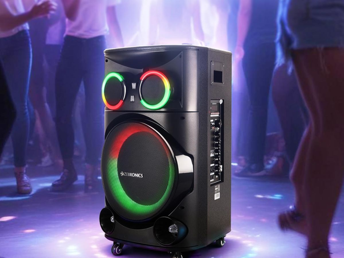 The ZEBRONICS GINOX Plus party trolley DJ speaker is priced at Rs 19,999 and delivers 160W output power. It offers up to 10 hours of battery backup on a single charge. The speaker supports Bluetooth V5.0, TWS connectivity, USB, and memory card playback options. It includes two UHF wireless microphones along with mic and guitar input support. The device features a 12-inch full range driver and RGB LED lights for party ambience. It also has auxiliary input and output ports for connectivity.