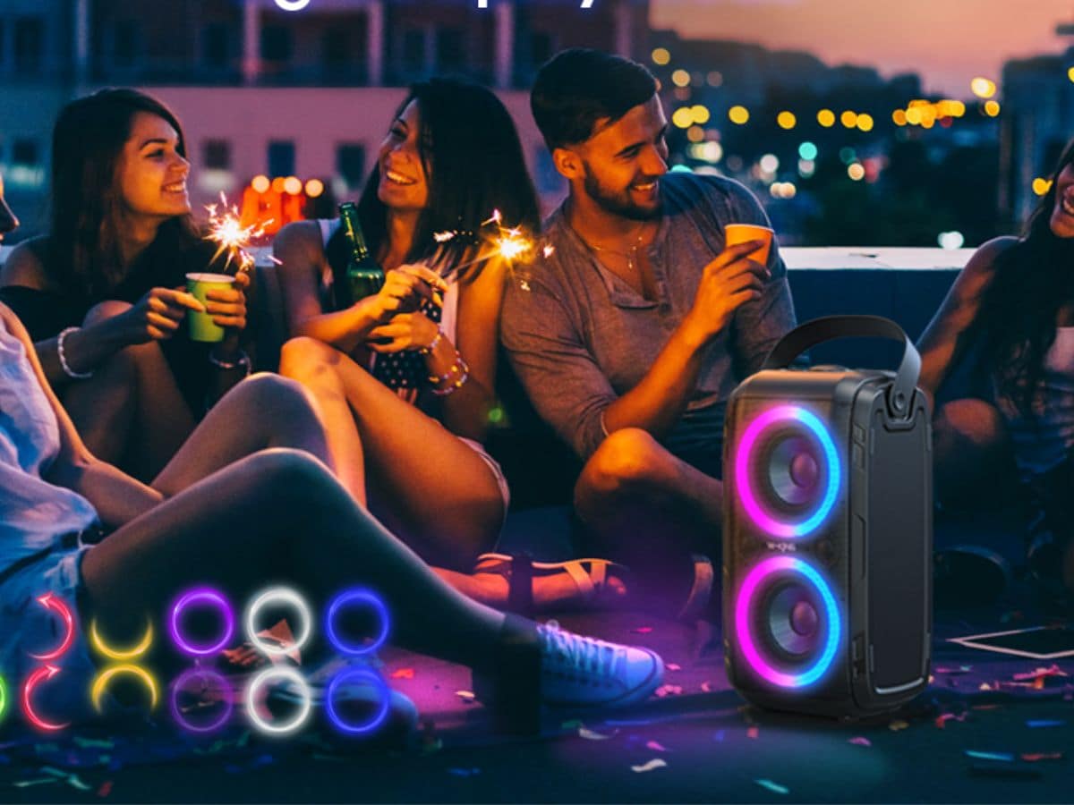 The Portronics Iron Beats 5 Prime party speaker is priced at Rs 17,990 and delivers 250W output power. It comes with dual 8-inch subwoofers for strong bass performance. The speaker offers up to 6 hours of playback time on a single charge. It supports wireless karaoke using a UHF microphone and includes smiley LED lights for party ambience. The device also features bass boost technology and has a wheeled design for easy portability.