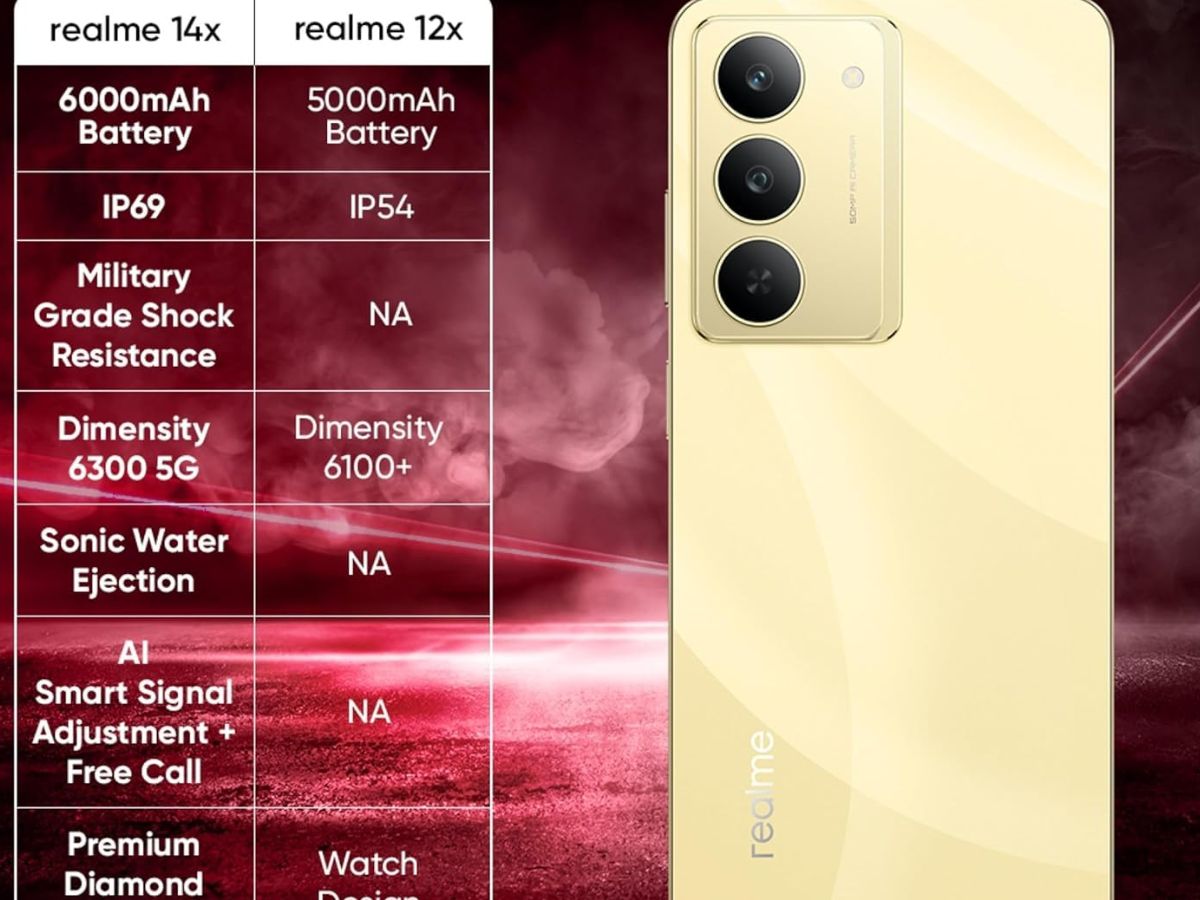 realme 14x 5G is priced at Rs 14,749. It comes with Dimensity 6300 5G chipset, Android 14 || Realme UI 5.0, 50MP AI Camera, IP69 Certification, 45W Fast Charging, Touchscreen, Microphone, Buttons, OCR, and more.