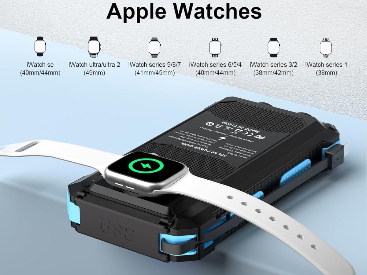 The Solar Charger power bank is priced at Rs 9,995. It offers a large 49800 mAh battery with support for PD 18W and QC 3.0 fast charging. The device comes with built-in cables, USB Type C, 6 outputs, and 2 input options for multiple devices. It also supports wireless charging, making it suitable for outdoor and heavy usage.