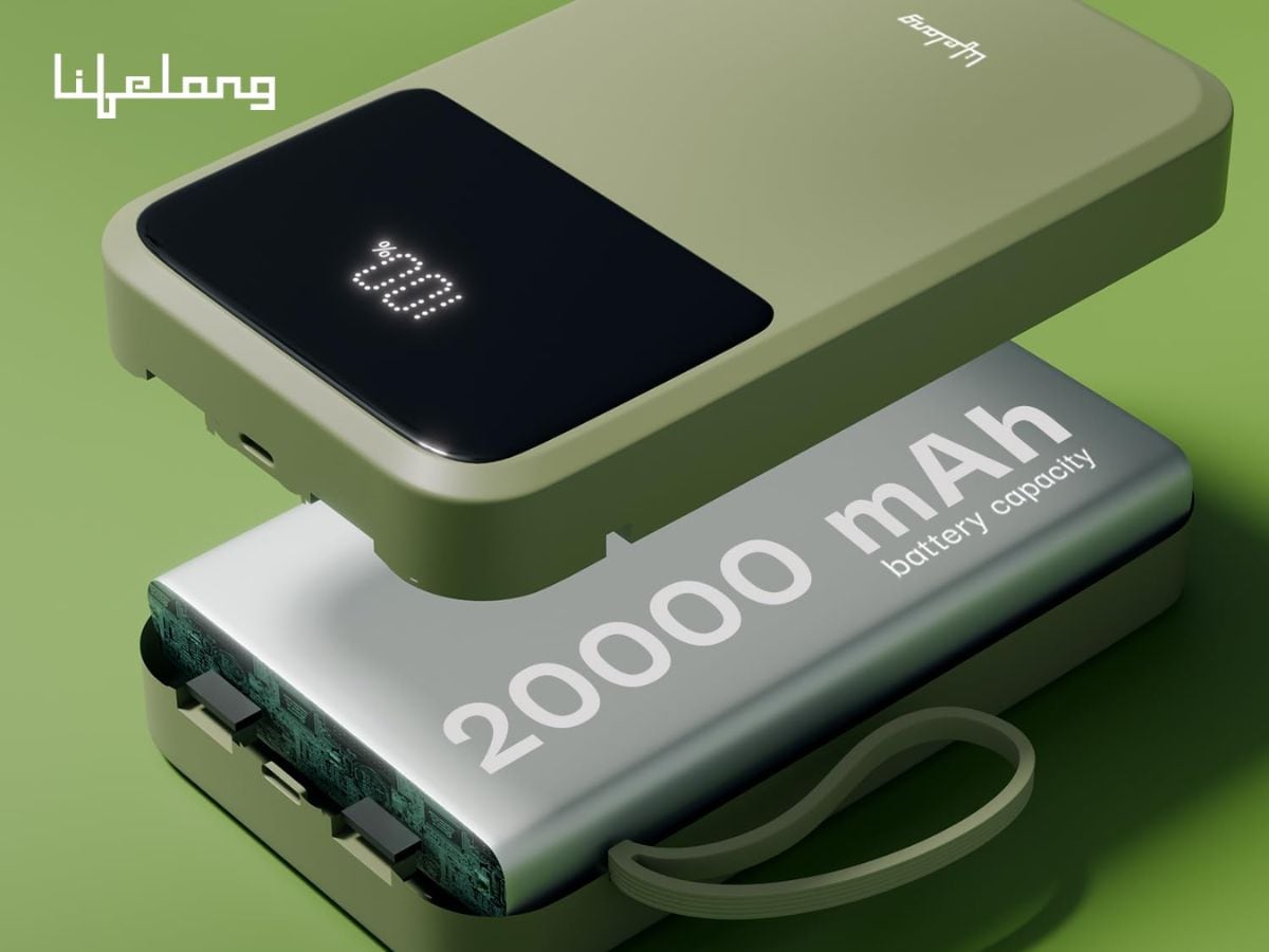 Lifelong Electronics 20000mAh power bank supports 22.5W fast charging and includes three input options: built-in USB, Lightning, and Type-C ports. It offers six output options with three integrated cables, one Type-C port, and two USB ports for multiple device charging. The power bank supports QC 3.0 quick charging technology for faster power delivery. The price of the product is Rs. 1,779.