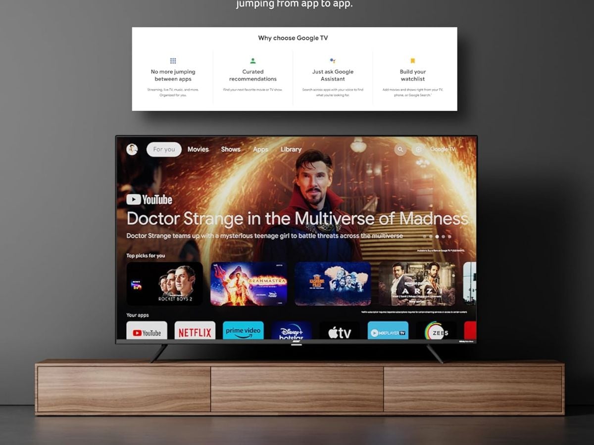 TCL 108 cm (43 inches) 4K Ultra HD Smart QLED Google TV comes with 2 GB RAM, 16 GB ROM, and a 64-bit quad-core processor. It features Wi-Fi 4 connectivity, multiple eye care modes, and Google Assistant support. The TV supports apps like Prime Video, Netflix, Hotstar, Zee5, and more. The price of this TV is Rs 27,990.