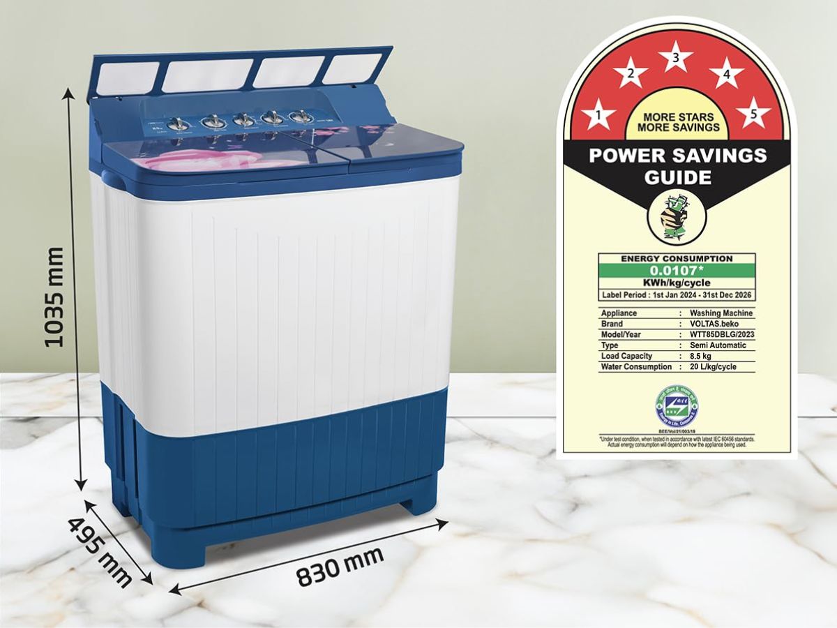 Voltas beko, A Tata Product 8.5 kg 5 Star Semi-Automatic Top Load Washing Machine With Double Water Fall technology costs Rs 11,290. It has Special Pulsator & 5 Knob Control Method, Economical, Low water and energy function, involves manual effort; Has both washing and drying functions
