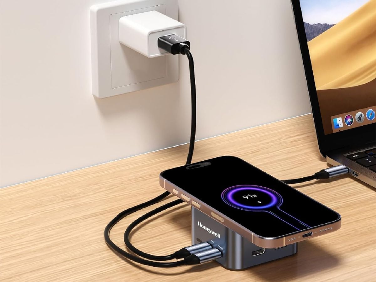 Honeywell 12-in-1 Type C Dock supports 4K HDMI output and 15W MagSafe wireless charging. It includes four USB ports, 100W Power Delivery support, Ethernet port, microphone input, and audio port. The dock also provides SD and microSD card slots and works with Type C devices including Windows laptops and MacBook. The price of the Honeywell 12-in-1 Type C Dock is Rs 4,172.