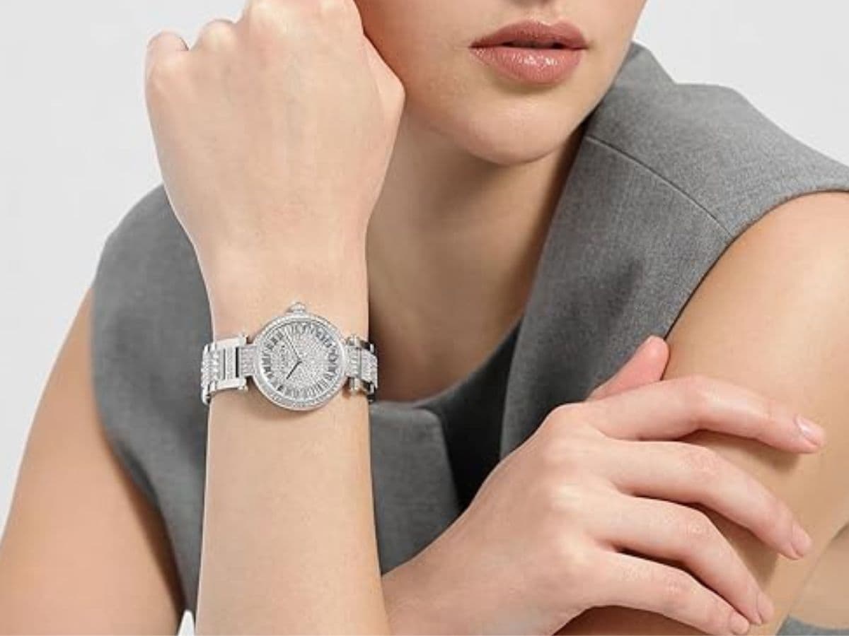 The Coach Cary Quartz women’s watch features a silver round dial with a 34mm case and is priced at Rs 35,819. It uses quartz movement and comes with a hardened mineral crystal glass that protects the watch from scratches.