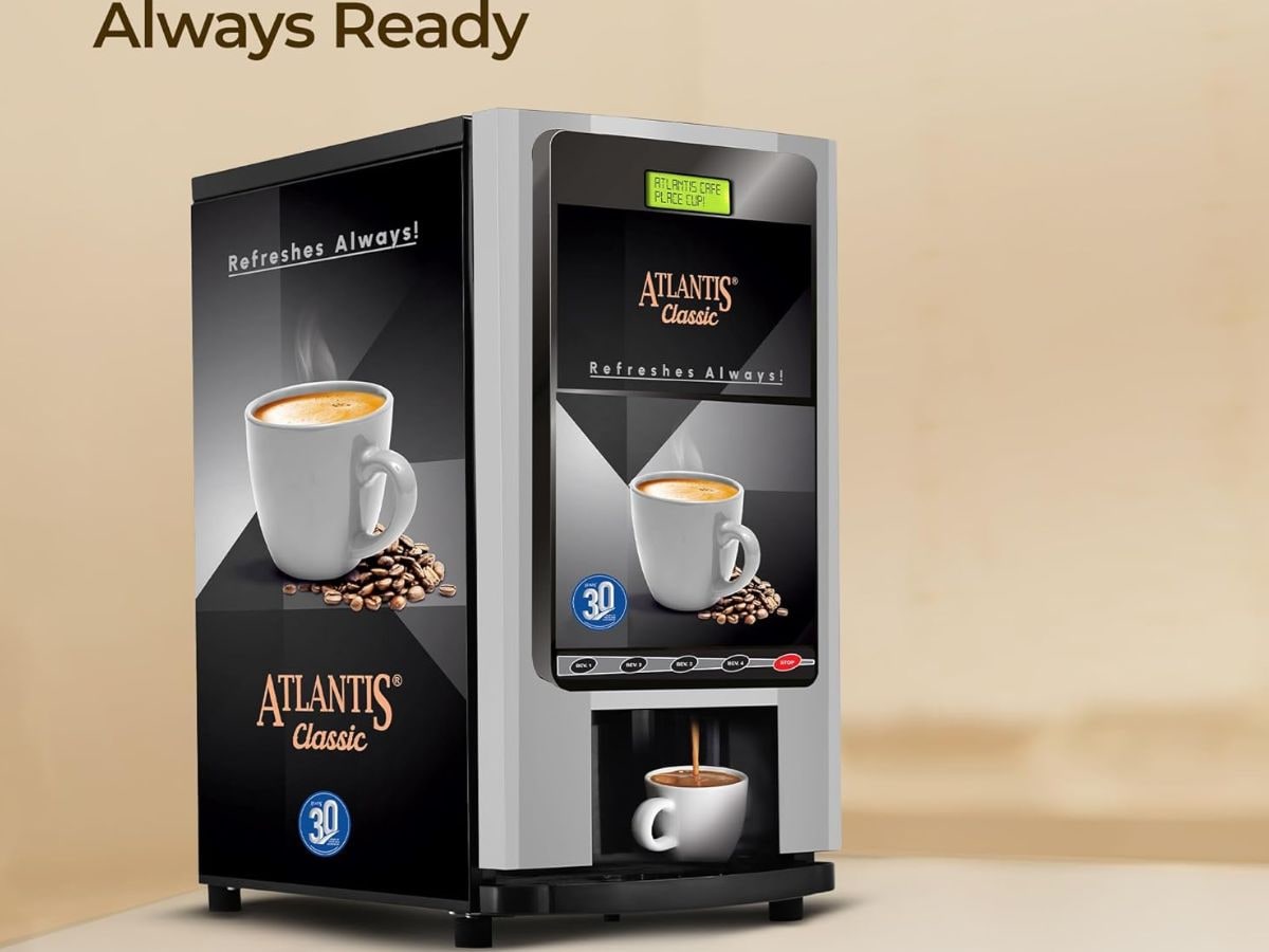 The ATLANTIS Classic 3 lane tea and coffee vending machine is priced at Rs 20,999 and supports premix based instant hot beverages. It comes with a 3 liter hot water tank for continuous serving. The machine features three dispensing lanes for different beverages. It is suitable for offices, shops and institutions.