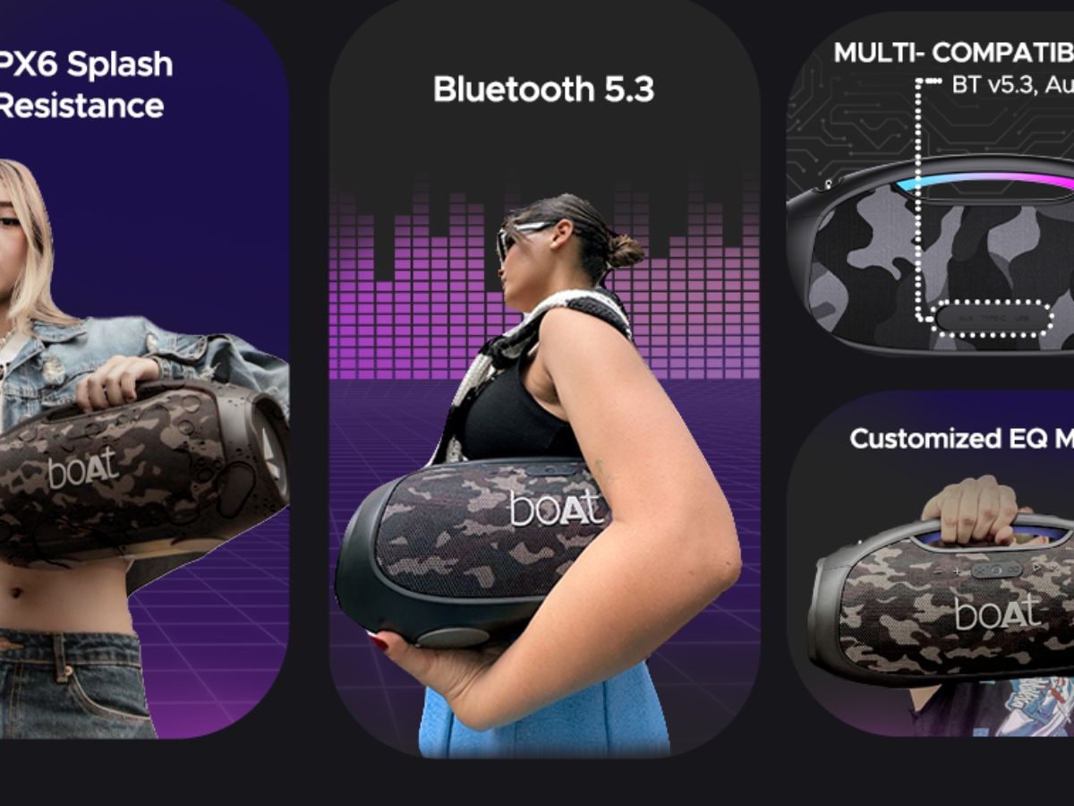 The boAt Stone 1800 Bluetooth Speaker is equipped with the w/ 90 W RMS Sound and RGB LEDs. There are EQ Modes and it is IPX6 rating. Buyers will also get Bluetooth v5.3 along with Multi- Compatibility– Aux USB. The playback time of Boat Stone speaker is up to 5 Hours & it has type C Charging connectivity. It is available in Camo Black color and can be bought at Rs 6,999.