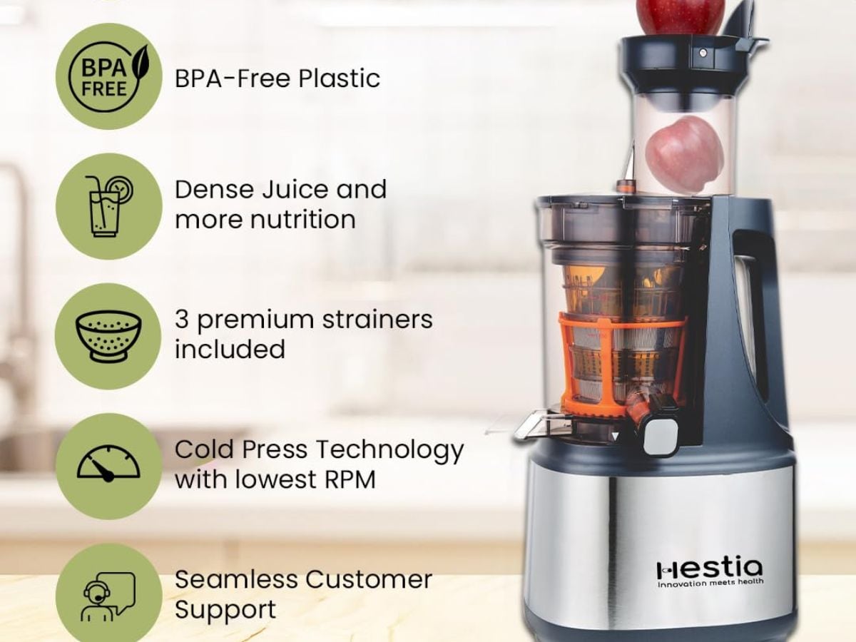 Hestia Nutri-Max Professional Cold Press Slow Juicer comes with a 240 W motor for efficient juice extraction. It uses patented auger technology for higher juice yield. The juicer includes three strainers for juice, sorbet, and nut milk. The price of the product is Rs 16,999.