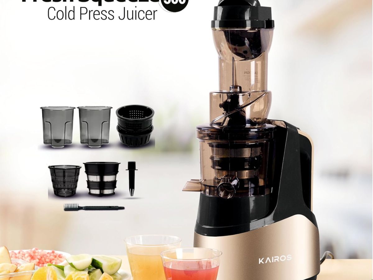 Kairos Fresh Squeeze 500 Cold Press Electric Juicer uses a cold press method for juice extraction. It has a large feeding tube and a reverse function for smooth operation. The juicer supports multiple uses like juice, sorbet, and smoothies with a smart lock feature. The price of the product is Rs. 17,400.