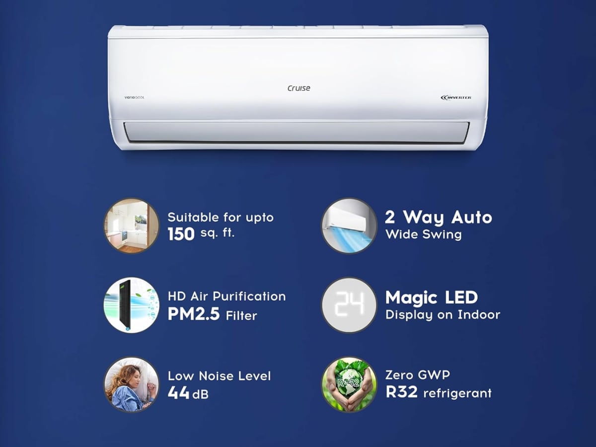 Cruise 1.5 ton 3 star inverter split AC comes with a copper coil and 4 in 1 convertible cooling. It offers fast cooling performance with new BEE rating support. The AC includes 7 stage air filtration with PM 2.5 filter and anti rust technology. The price of this AC is Rs 27,990.