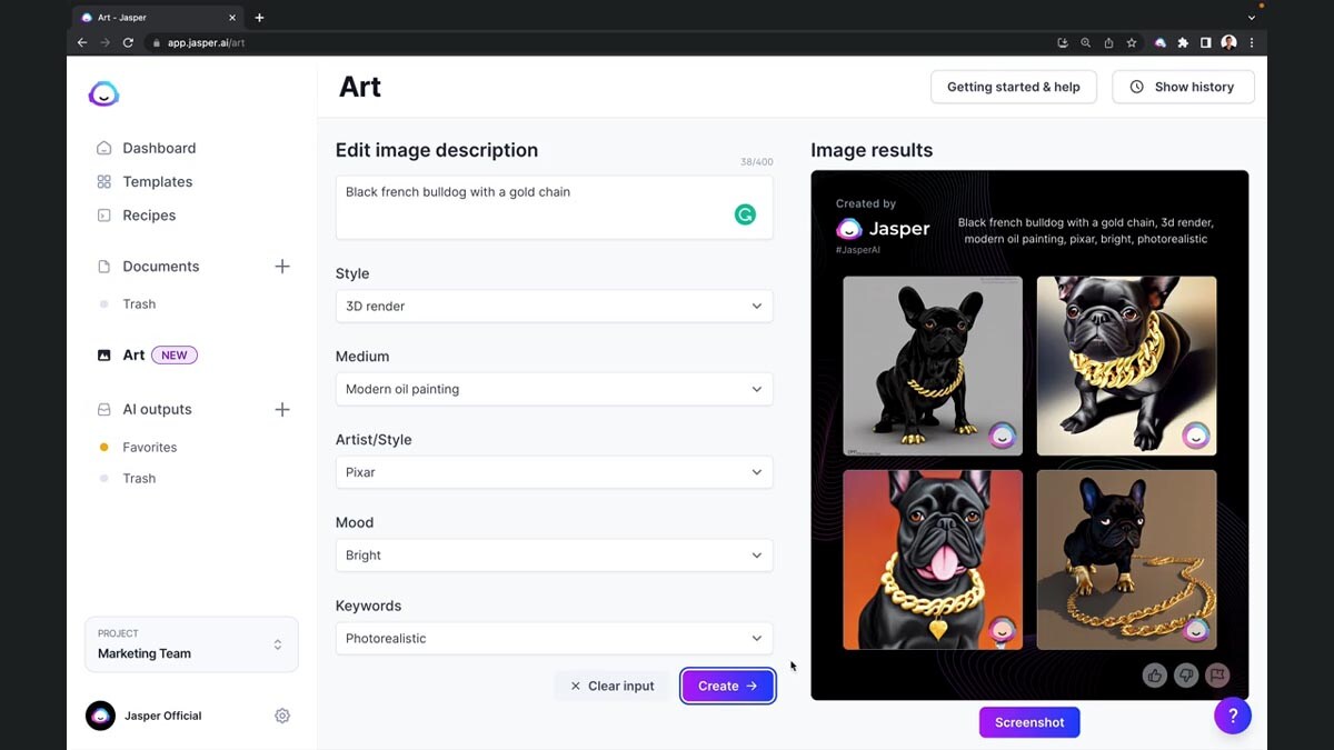 Jasper's AI generation tool is paid but it offers a high degree of accuracy. Just write what you want and it will create an image for you.