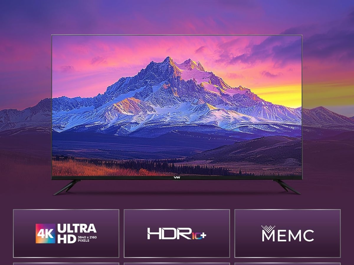 This VW 43-inch 4K Ultra HD Smart QLED TV is priced at Rs 19999 and offers a QLED display with HDR10+ and wide color gamut. It runs on Android 14 based Google TV and supports apps and streaming services. The TV comes with a web touch remote and voice assistant for easy control. It also uses Uni Lucent technology to enhance picture quality.