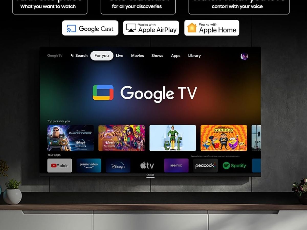 The ONIDA 139 cm (55 inches) Nexg Series 4K Ultra HD LED Smart Google TV features 4K HDR, Live Colour, and a wide viewing angle. It is powered by the Pixa Visual Engine and supports Eye Protect Plus. The TV includes apps such as Netflix, Amazon Prime Video, Disney+ Hotstar, Sony Liv, and Zee5. It is priced at Rs. 27,647.
