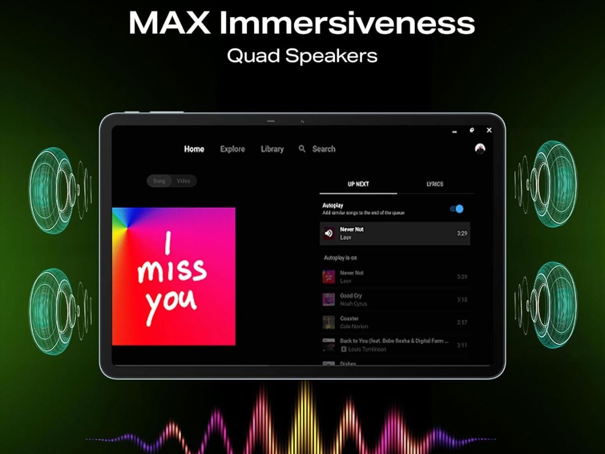 Realme Pad 2 Lite (Space Grey, 4GB RAM, 128GB Storage) is priced at Rs 13,675 and features a 10.9-inch 2K Eyecomfort display with 90Hz refresh rate, MediaTek Helio G99 processor, 8300mAh battery, quad speakers, and supports both 4G calling and Wi-Fi connectivity.