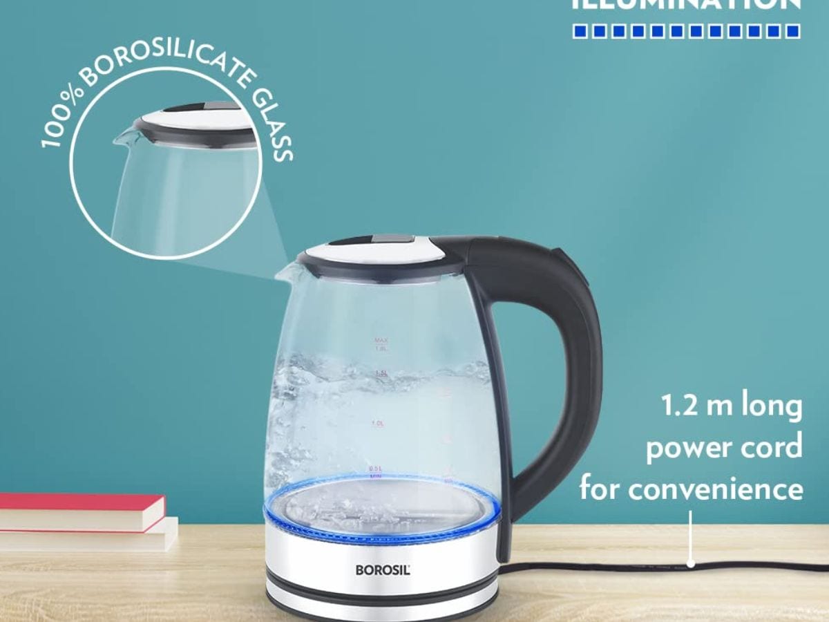 The Borosil 1.8L Electric Glass Kettle is priced at Rs. 1,849. It has a borosilicate glass body with blue backlight and a 360° swivel base. The kettle features auto cut-off, a spout filter, and cord winder. It supports fast boiling and comes with a 1-year warranty.