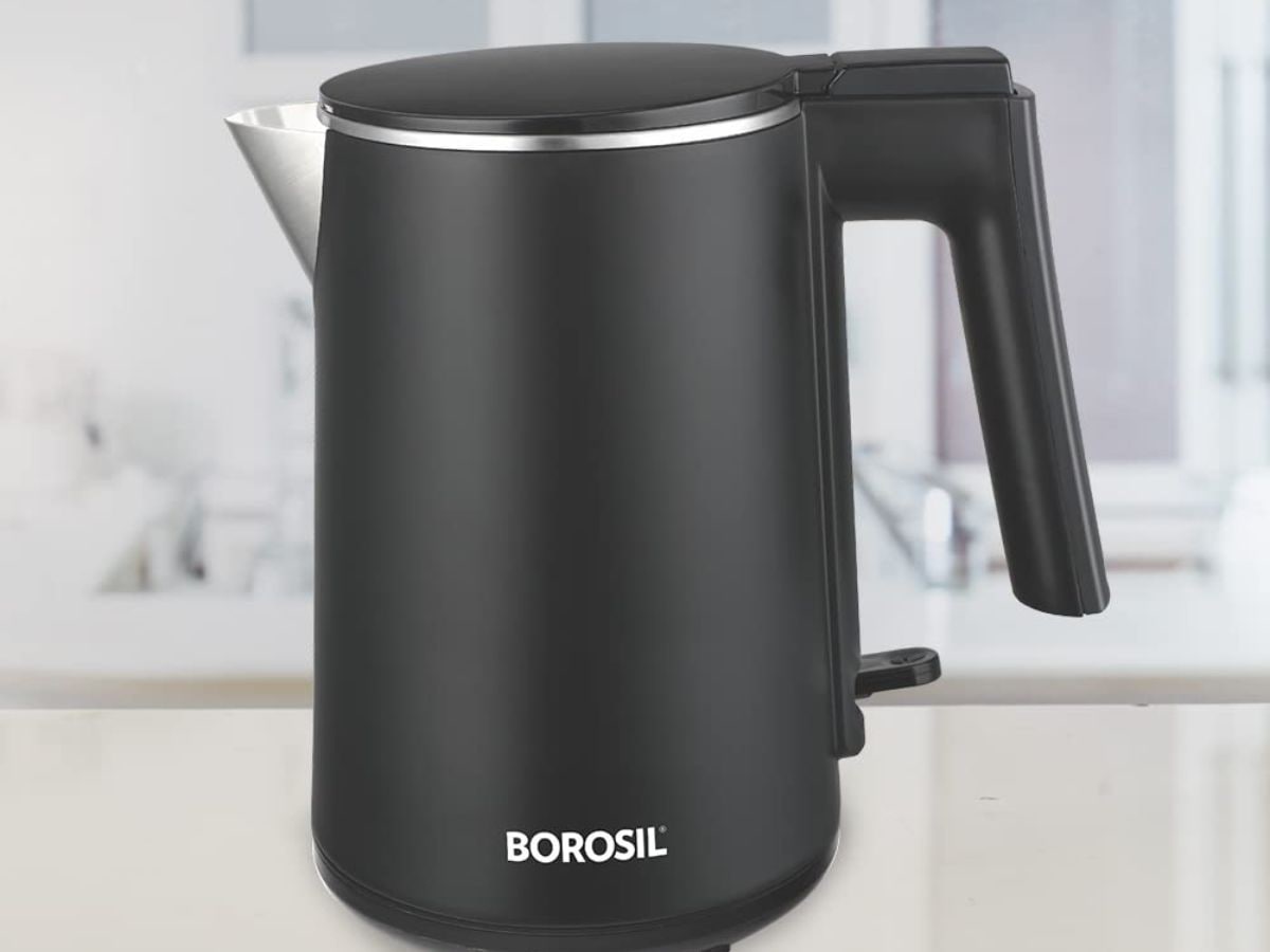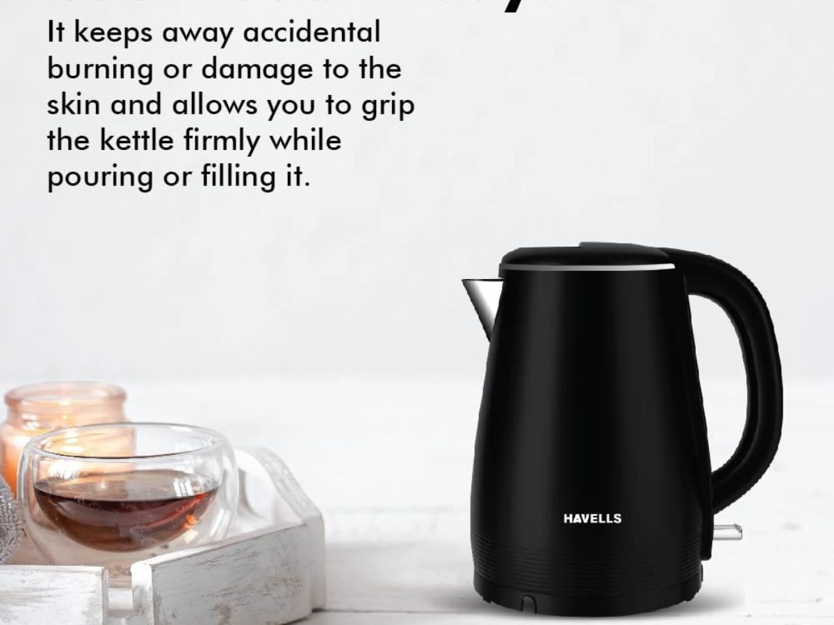 The Havells Electric Kettle Altro 1.5L is priced at Rs. 1,749. It has a double-layered cool touch outer body and a 304 rust-resistant stainless steel inner body. The kettle runs on 1250 watts and features auto shut-off and a wider mouth for easy filling. It comes with a 2-year manufacturer warranty.