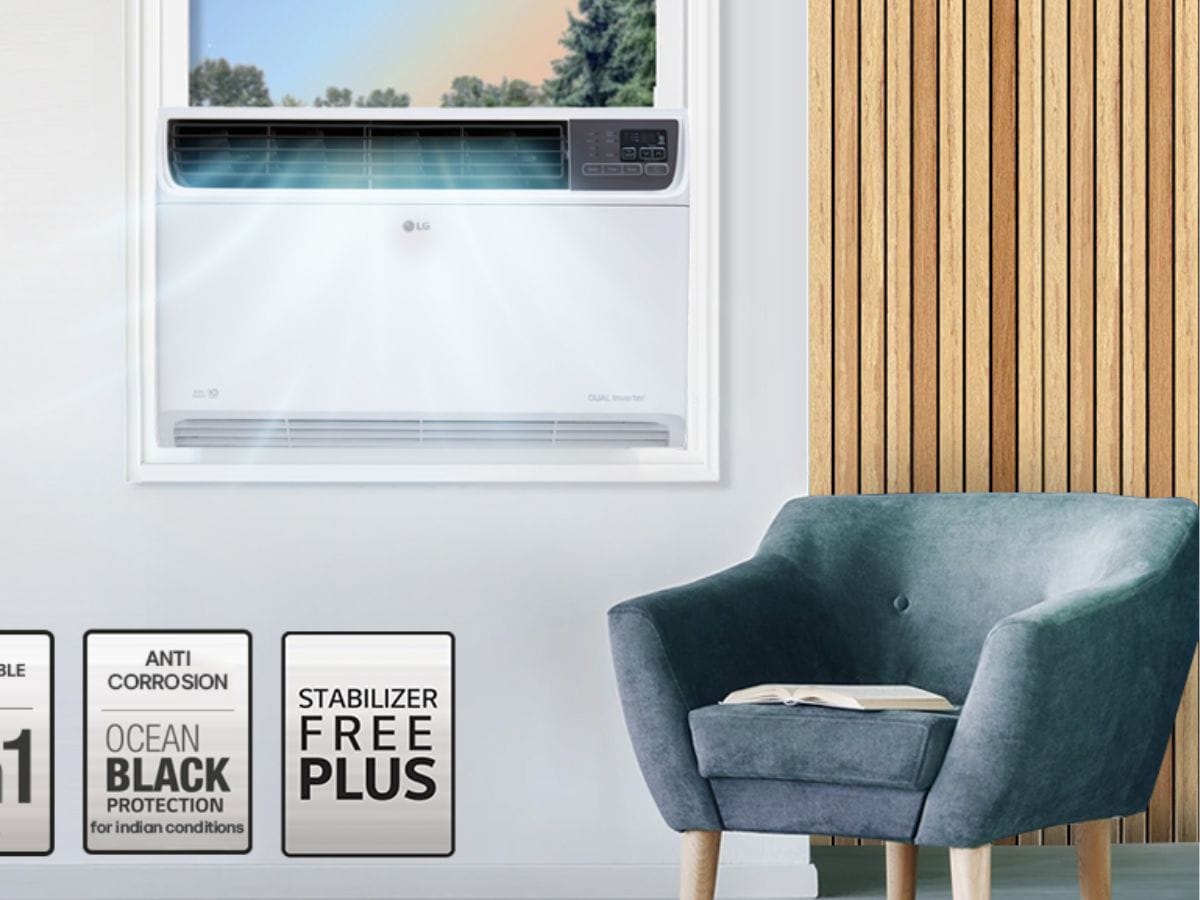 The LG 1.5 Ton 3 Star DUAL Inverter Window AC costs Rs 36,990 with features like Copper, Convertible 4-in-1 cooling, 4 Way Air Swing, HD Filter, Inverter Compressor, Remote Controlled, Filter Light Reminder, 4 Way Swing, Fast Cooling.