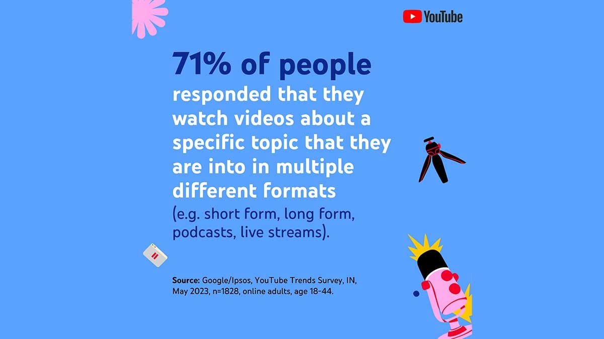 Youtube has revealed that over 71 percent of people watch videos about a specific topic that they are into in multiple formats. This again includes formats like shorts, podcasts, live streams, and regular videos.