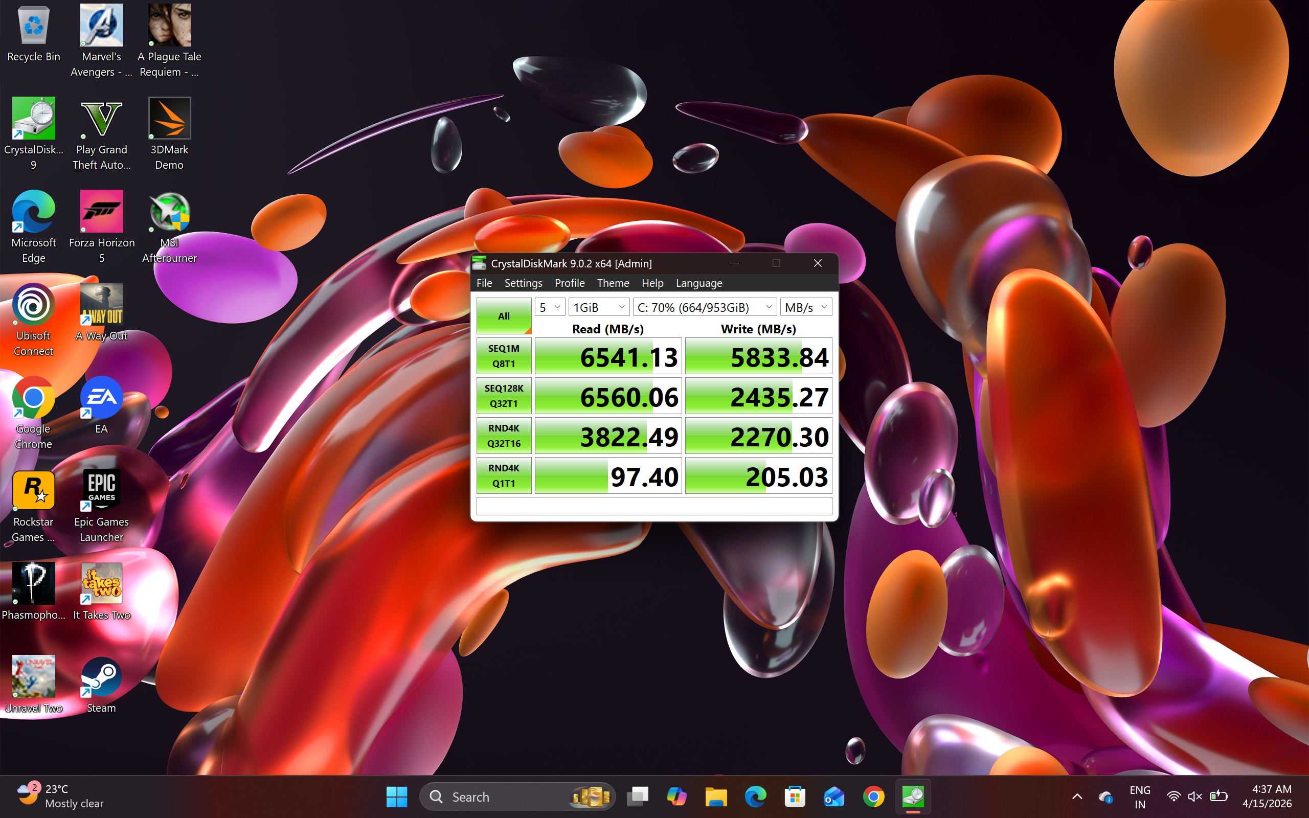 The storage performance was fine. In CrystalDiskMark, the SSD has read speeds at 6541 MB/s, and write speeds of up to 5833 MB/s.