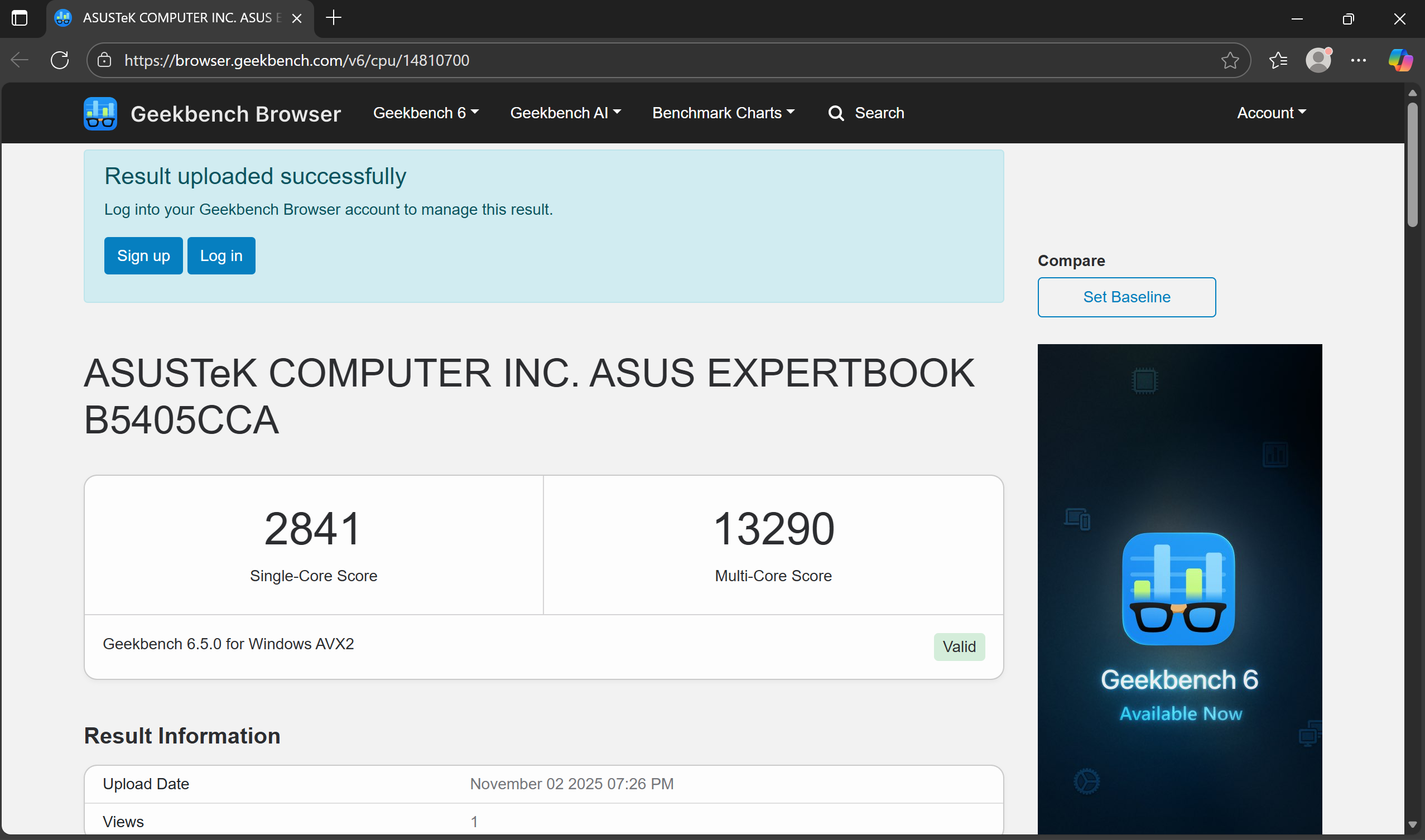 Even in benchmarks, the laptop aced in terms of numbers. In Cinebench, the ExpertBook B5 scored 12,944 in the multi-core test and 1,851 in the single-core test. In Geekbench, it scored around 2,841 in the single-core and 13,290 in the multi-core test. To check the SSD speeds, I even tried CrystalDisk, and the results were pretty good.